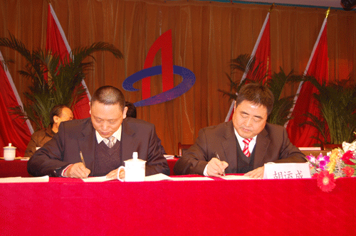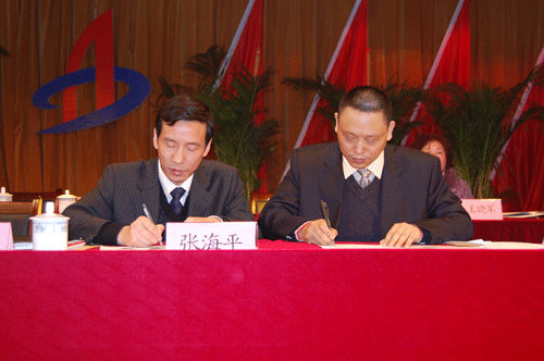 公司黨委書記李世龍與集團公司黨委書記張海平(左一)簽訂2010年黨委目標(biāo)考核責(zé)任書