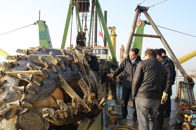 次日一早,戴總、崔主任不辭辛苦,親臨項目施工現(xiàn)場,登上挖泥船,就3800型挖泥船效率、排泥管跨越鐵路線問題進行分析,并提出有針對性解決措施,幫助、指導(dǎo)項目部解決施工難點。最后,戴總提出三點要求:一是鼓勵技術(shù)人員開動腦筋,用創(chuàng)新思維解決實際困難;二是項目公司要加強與當(dāng)?shù)卣臏贤?,協(xié)調(diào)好拆遷補償及當(dāng)前存在的突出問題;三是項目部要在確保安全的前提下,加快工程進度,早日完成工程量。