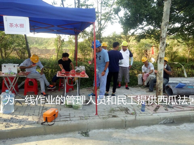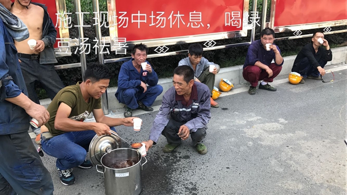 本次送清涼不但為一線作業(yè)人員帶來(lái)了水、西瓜和防暑藥品,更設(shè)立了茶棚,每天為一線人員提供綠豆湯和冰水,將關(guān)愛(ài)制度化常態(tài)化,讓大家沒(méi)有后顧之憂,全心全意奮戰(zhàn)到施工生產(chǎn)中去。