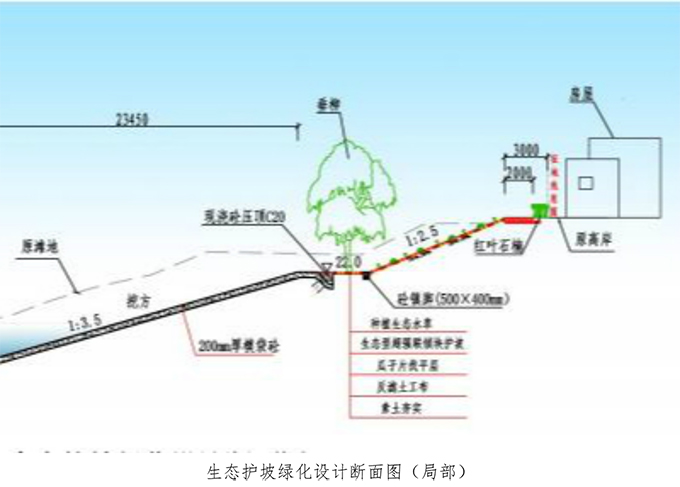 護(hù)岸工程。本工程岸坡防護(hù),頂部防護(hù)至河道原有河灘地,底部為防止基礎(chǔ)受進(jìn)一步淘刷二防護(hù)至河底。在正常蓄水位22.0處設(shè)平臺,平臺以及平臺以上至堤頂采用生態(tài)型連鎖塊護(hù)坡,平臺以下范圍內(nèi)采用生態(tài)膜袋砼護(hù)岸,坡頂設(shè)置兩米寬C30混凝土路面,路面靠岸側(cè)種植灌木。
