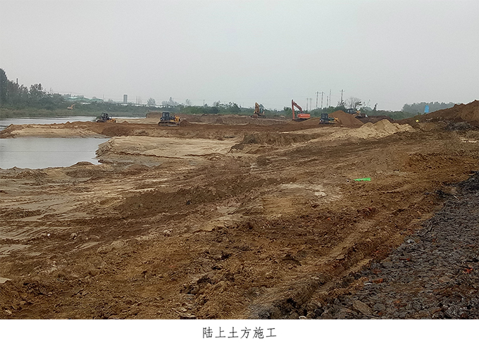 疏浚工程。選用合適挖泥船船型是工程順利進(jìn)行的關(guān)鍵,本項(xiàng)目采用全分體式、斗輪式挖泥船,便運(yùn)輸,適合開挖四級以上土類型,設(shè)備性能可靠,功效高。水下土方主要采用絞吸式挖泥船施工,管道輸送;表層土含樹根等雜物,采用抓斗船清障;陸上土方采用挖掘機(jī)開挖,渣土車運(yùn)輸。