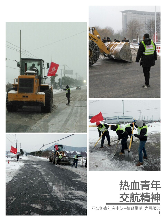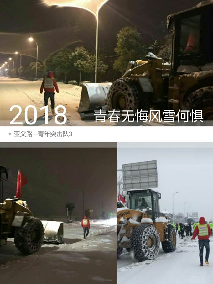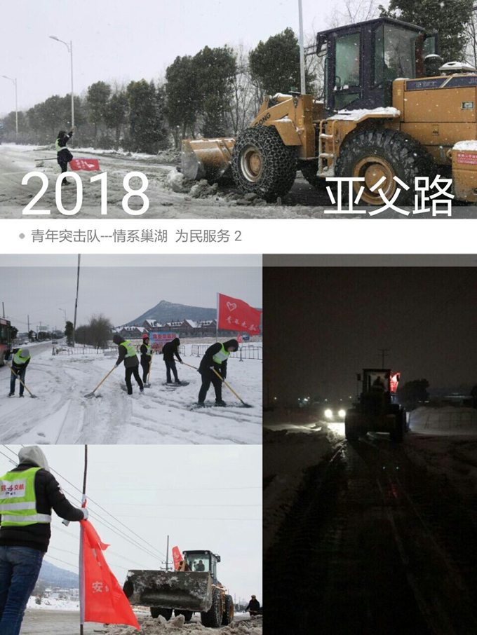2018年1月27日,巢湖市迎來了一場大雪,紛飛的大雪持續(xù)了整夜,零下低溫導致路面結(jié)冰嚴重,出行十分不便。亞父路項目部青年突擊隊積極響應巢湖市政府的號召,組織了一支鏟雪突擊小組,在長江東路、亞父路開展鏟冰除雪活動,為市民“開路”。