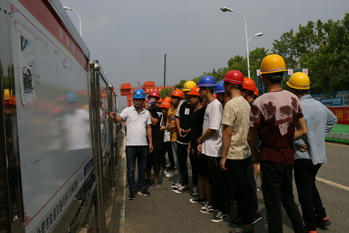在參觀施工現(xiàn)場(chǎng)的過(guò)程中,干凈、整潔、有序的施工場(chǎng)地,洞內(nèi)清爽的環(huán)境及規(guī)化有序的風(fēng)、水、電管線路、機(jī)具放置等都給前來(lái)參觀的同學(xué)們留下了深刻的印象。來(lái)訪師生聽取了項(xiàng)目技術(shù)人員對(duì)工程建設(shè)情況的介紹,了解地鐵深基坑開挖的施工工藝流程,大學(xué)生們仔細(xì)聽、認(rèn)真記,不少學(xué)生下到基坑深處參觀實(shí)體工程,感概頗多,認(rèn)識(shí)到書本知識(shí)與實(shí)體工程施工的差距,激發(fā)他們向?qū)嵺`學(xué)習(xí)的興趣。項(xiàng)目技術(shù)人員還就學(xué)生提出的各種疑問(wèn)進(jìn)行了詳細(xì)解答,加深了大學(xué)生們對(duì)實(shí)踐活動(dòng)的認(rèn)知。