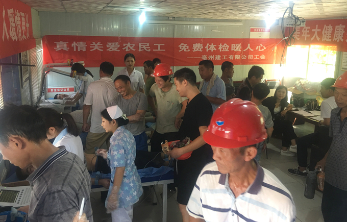 為進(jìn)一步關(guān)心關(guān)愛(ài)農(nóng)民工,打造平安工地,7月17日至19日,亳州建工工會(huì)聯(lián)合美年大健康體檢中心為各在建項(xiàng)目300余名農(nóng)民工進(jìn)行了免費(fèi)體檢。