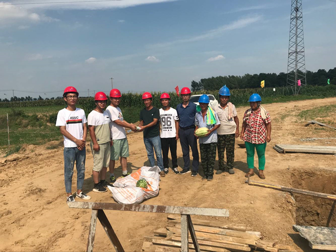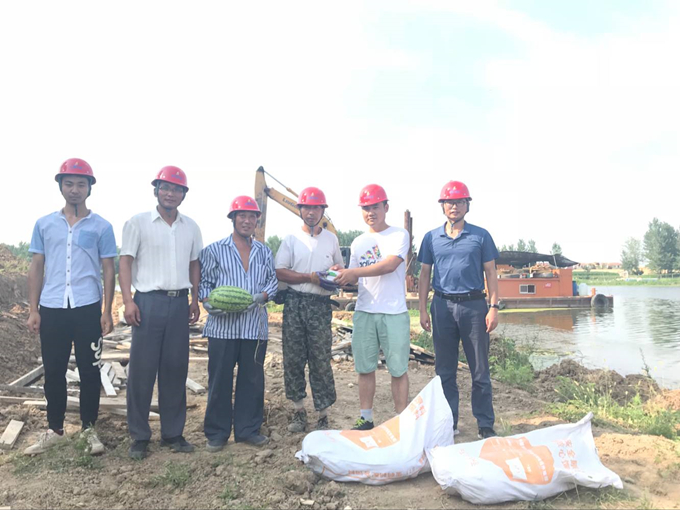沱澮河項目部領導班子成員前往各施工班組,給正在烈日下作業(yè)的一線工人送去西瓜、仁丹、藿香正氣水等防暑降溫用品,以表示對各個崗位上的一線工人在高溫環(huán)境工作的關懷。并向他們強調,一定要注意防暑降溫,保護好身體,合理排班,杜絕中暑情況發(fā)生。