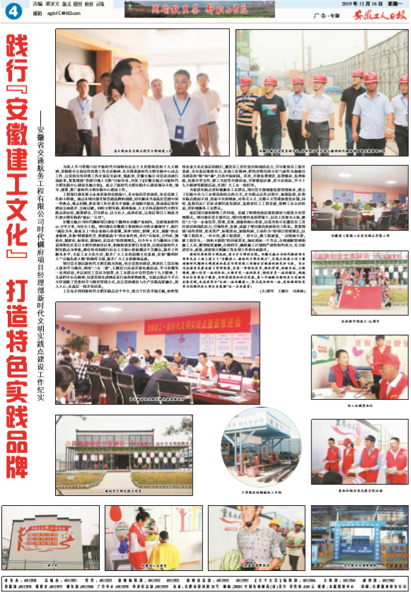 2019年12月16日出版的《安徽工人日報》以“踐行安徽建工文化,打造特色實踐品牌”為題,整版報道了安徽交航公司時代樾府項目新時代文明實踐點建設工作紀實。