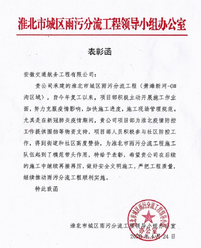 日前,淮北市城區(qū)雨污分流工程領(lǐng)導(dǎo)小組辦公室發(fā)來表彰函,對安徽交航公司在淮北雨污分流工程項(xiàng)目中積極推進(jìn)復(fù)工復(fù)產(chǎn)及疫情防控工作給予了高度贊揚(yáng),并希望安徽交航公司在后續(xù)施工中再接再厲,做好安全文明施工,嚴(yán)把工程質(zhì)量,繼續(xù)推動(dòng)雨污分流工程順利實(shí)施。