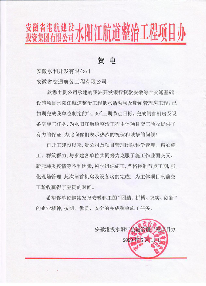 《賀電》指出,自開工建設(shè)以來(lái),安徽交航及項(xiàng)目管理團(tuán)隊(duì)科學(xué)管理、精心施工、群策群力,與參建各單位共同努力克服了施工作業(yè)面交叉、新冠肺炎疫情等不利因素,科學(xué)組織施工,嚴(yán)格控制節(jié)點(diǎn)工期,強(qiáng)化現(xiàn)場(chǎng)管理,此次閘首機(jī)房及設(shè)備房的完成,為主體項(xiàng)目汛前交工驗(yàn)收贏得了寶貴時(shí)間。同時(shí),希望安徽交航水陽(yáng)江項(xiàng)目部繼續(xù)發(fā)揚(yáng)“團(tuán)結(jié)、拼搏、求實(shí)、創(chuàng)新”的企業(yè)精神,按期、按質(zhì)、安全的完成剩余施工任務(wù)。