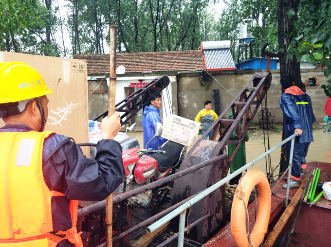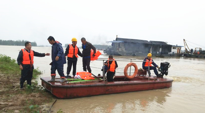 受持續(xù)強(qiáng)降雨影響,防汛抗洪形勢(shì)極其嚴(yán)峻。7月19日,安徽交航引江濟(jì)淮疏浚工程項(xiàng)目經(jīng)理衛(wèi)邦宏一早接到當(dāng)?shù)卮逦瘯?huì)電話通知,當(dāng)?shù)睾拥浪簧蠞q,導(dǎo)致附近有兩戶村民被困,跨河高壓線也存在安全隱患。