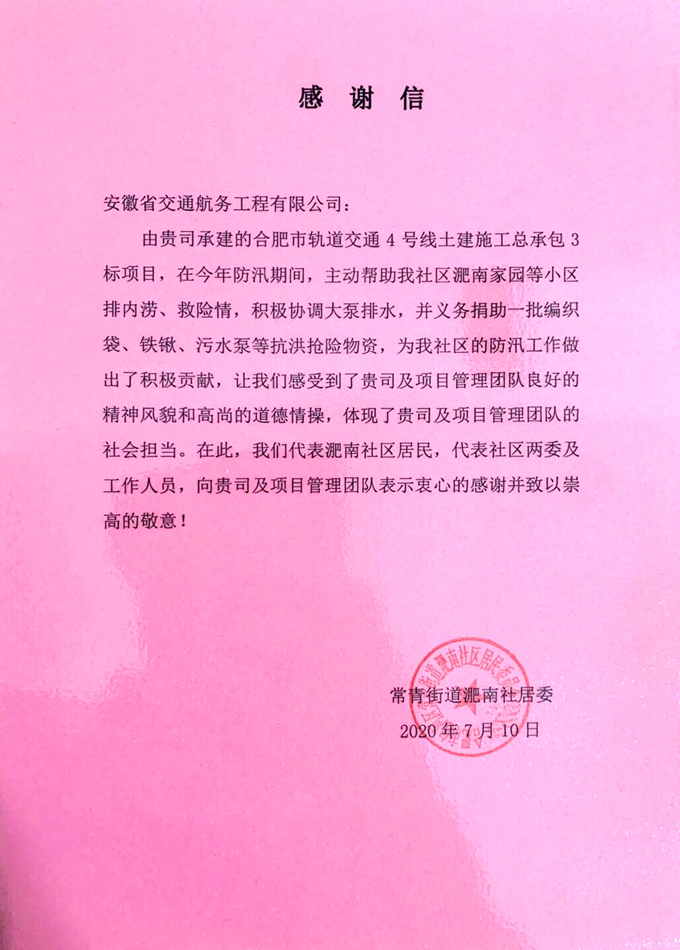 7月28日早上,安徽交航合軌4號線TJ03標(biāo)項目部收到一封來自駐地社居委送來的感謝信,對項目部主動幫助社區(qū)排內(nèi)澇、救險情以及義務(wù)捐助防汛物資的志愿服務(wù)行動給予了高度贊揚,并表達(dá)了由衷感謝。