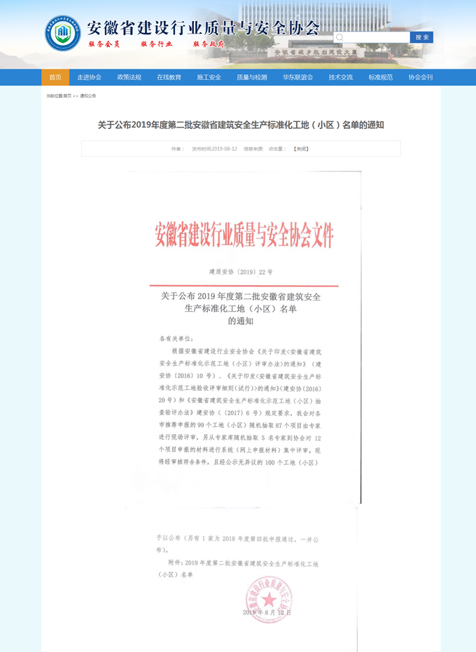 8月7日,安徽省建設(shè)行業(yè)安全協(xié)會正式公布了《2019年度第二批安徽省建筑安全生產(chǎn)標(biāo)準(zhǔn)化工地(小區(qū))名單》,安徽交航公司承建的合軌4號線TJ03標(biāo)項(xiàng)目位列其中,榮譽(yù)獲評“安徽省建筑安全生產(chǎn)標(biāo)準(zhǔn)化工地”。