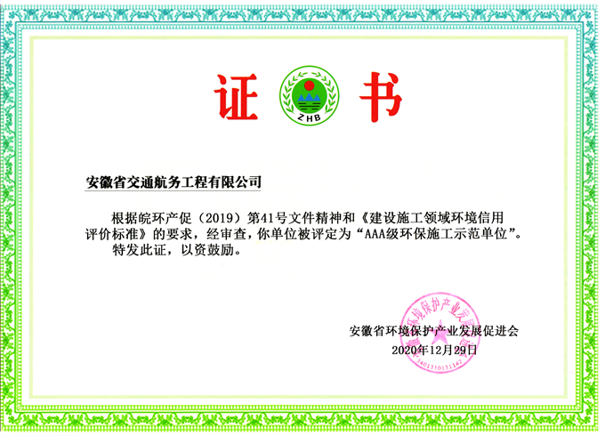 近日,經(jīng)安徽省環(huán)境保護產(chǎn)業(yè)發(fā)展促進會評估,安徽交航公司再次榮獲“AAA級環(huán)保施工示范單位”稱號。