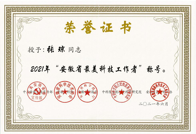 據(jù)了解,2021年“安徽省最美科技工作者”學習宣傳活動由中共安徽省委宣傳部、安徽科協(xié)、安徽省科技廳、中科院合肥物質(zhì)科學研究院、安徽省國防科工辦聯(lián)合舉辦,旨在進一步弘揚中國科學家精神,激發(fā)廣大科技工作者的榮譽感、自豪感、責任感,引導和激勵廣大科技工作者學習最美、爭當最美,以飽滿的精神狀態(tài)和昂揚的奮斗姿態(tài)迎接新時代、踏上新征程,匯聚起建設新時代現(xiàn)代化美好安徽、 實現(xiàn)中華民族偉大復興中國夢的磅礴力量。經(jīng)過主辦單位專家的層層選拔和嚴格篩選,最終在全省范圍內(nèi)遴選確定了10位2021 年“安徽省最美科技工作者”,張瓊同志是唯一一位作為施工企業(yè)科技工作者獲得此項榮譽的獲獎者。