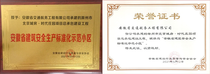 近日,從安徽省建筑行業(yè)質(zhì)量與安全協(xié)會(huì)傳來(lái)喜訊,安徽交航公司承建的滁州時(shí)代莊園項(xiàng)目榮獲“安徽省建筑安全生產(chǎn)標(biāo)準(zhǔn)化示范小區(qū)”榮譽(yù)稱號(hào)。