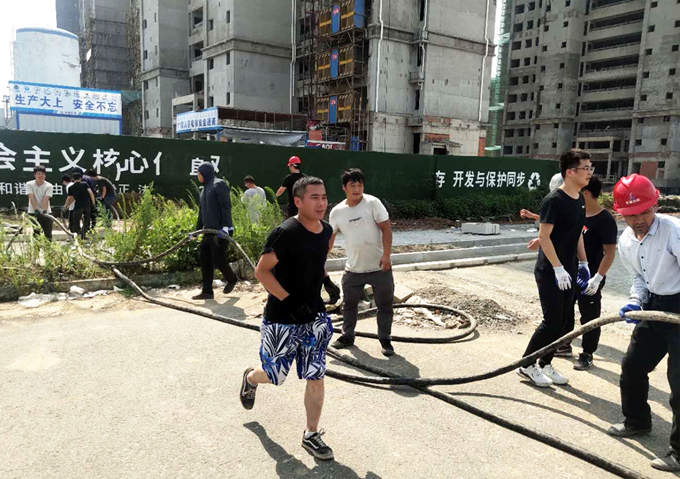 當日上午9:30,項目部全體黨員及管理人員頂著炎炎烈日,將電纜從施工現(xiàn)場鋪設至勞務工人生活區(qū),全長兩百余米。電纜如同一條游龍,在大家的手中緩緩移動。“一二三、一二三”響亮的口號聲不斷響起,大家團結一致,一米一米將電纜向指定的位置拉移。在30多度的高溫天氣下,在項目部全體員工的共同努力下,經(jīng)過1個多小時的奮戰(zhàn),終于順利完成電纜鋪設任務,保障了勞務工人的生活供電。