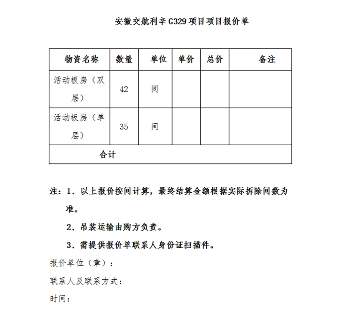 我公司位于亳州市利辛縣G329項(xiàng)目有一批廢舊活動(dòng)板房需處置(共計(jì)77間,2266.3㎡),現(xiàn)公開向社會(huì)尋求收購,歡迎有意向者參與。