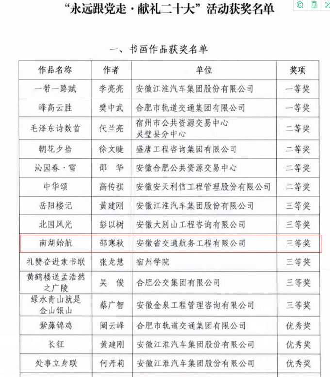 日前,由安徽省招標(biāo)采購(gòu)協(xié)會(huì)主辦的“永遠(yuǎn)跟黨走·獻(xiàn)禮二十大”作品征集評(píng)選活動(dòng)獲獎(jiǎng)作品名單揭曉!經(jīng)過(guò)激烈競(jìng)爭(zhēng),安徽交航公司《南湖始航》書(shū)法作品榮獲書(shū)畫(huà)類(lèi)作品三等獎(jiǎng)。