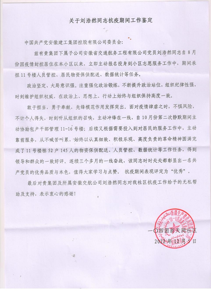 作為一名黨員,劉浩然沖鋒在前,與社區(qū)志愿者擰成一股繩,始終堅(jiān)持奮戰(zhàn)在疫情防控第一線,彰顯了國企員工的責(zé)任與擔(dān)當(dāng),獲得了屬地政府的一致肯定與好評。