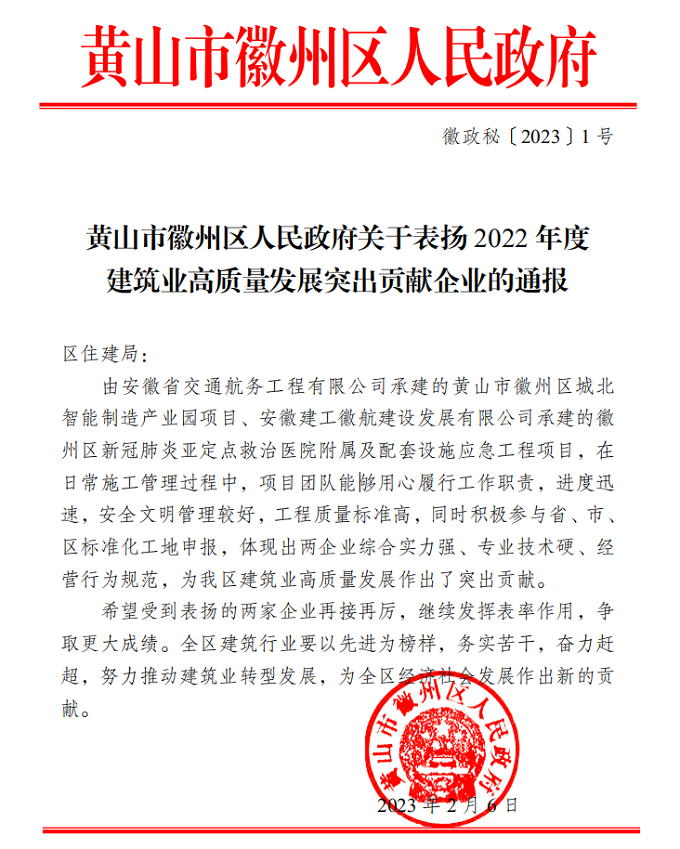 近日,黃山市徽州區(qū)人民政府發(fā)文通報表揚我公司承建的徽州區(qū)產(chǎn)業(yè)園項目及徽州區(qū)新冠肺炎亞定點救治醫(yī)院項目。