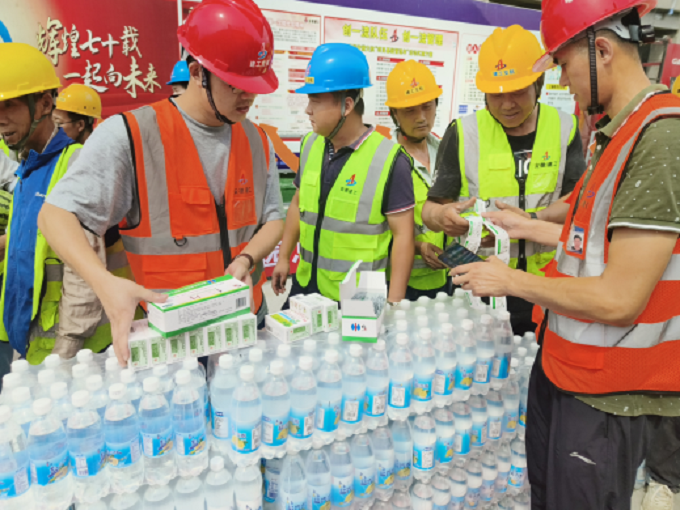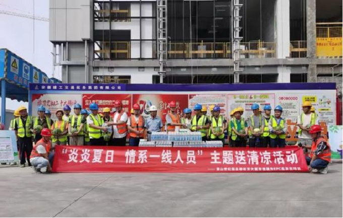 為貫徹落實(shí)公司及黃山市住建局有關(guān)安全工作要求,切實(shí)做好高溫天氣施工防暑降溫工作。近日,黃山世紀(jì)園總部經(jīng)濟(jì)大廈項(xiàng)目部組織開展“炎炎夏日 情系一線人員”送清涼活動(dòng),為現(xiàn)場作業(yè)人員發(fā)放毛巾、鹽汽水、風(fēng)油精、清涼油等防暑降溫物資。