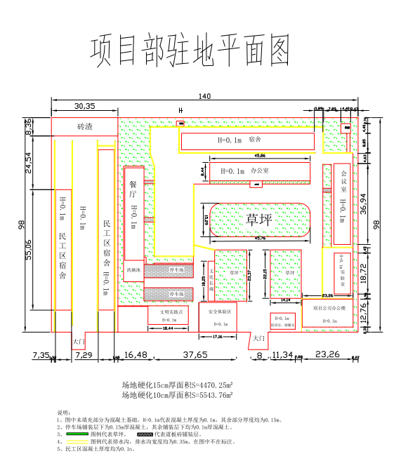 項目部現(xiàn)有單層活動板房51間(6.16米*3.64米*48間,6.16米*5.46米*2間,6.16米*14.56米*1間),雙層活動板房4排56間(6.16米*3.64米*53間,6.16米*7.28米*3間),總建筑面積約5193㎡;場地硬化總面積約10014㎡(其中15cm厚度約4470.25㎡,10cm厚度約5543.76㎡);其余綠化等附屬詳見拆除清單。
