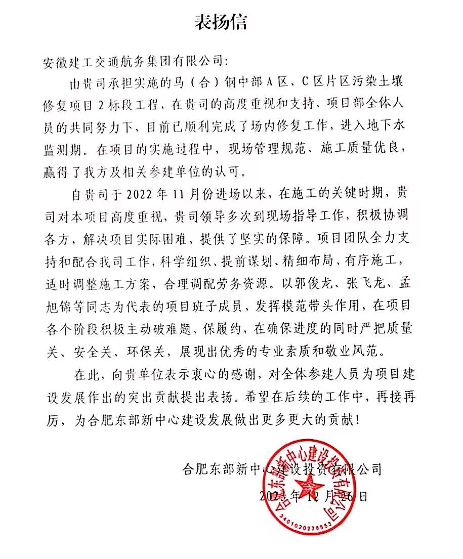 馬(合)鋼中部A區(qū)、C區(qū)片區(qū)污染土壤修復(fù)項目2標段工程積極主動破難題、保履約,提前謀劃、精心布局、有序施工,嚴把質(zhì)量關(guān)、安全關(guān)和環(huán)保關(guān),展現(xiàn)出優(yōu)秀的專業(yè)素養(yǎng)和敬業(yè)風范,收獲業(yè)主單位合肥東部新中心建設(shè)投資有限公司表揚。