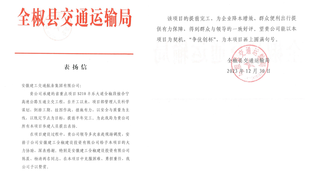 近日,公司承建的馬(合)鋼項目、S210豐樂大道全椒段接合寧高速公路互通立交項目和利辛雙創(chuàng)產(chǎn)業(yè)園項目喜獲表揚信。