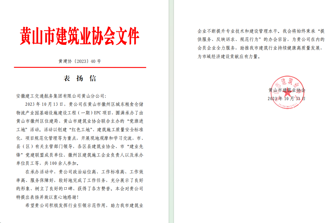 10月31日,建工交航黃山分公司收到黃山市建筑業(yè)協(xié)會發(fā)來的表揚信。信中對黃山分公司在所屬徽州區(qū)城東糧食倉儲物流園項目圓滿承辦“黨旗進工地”活動予以充分肯定。