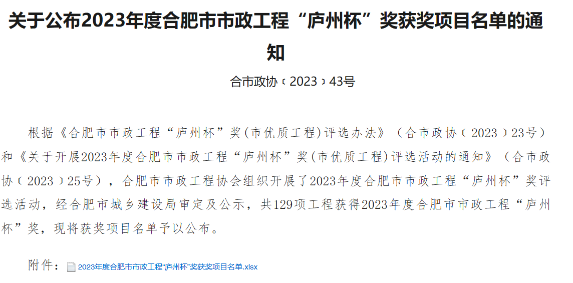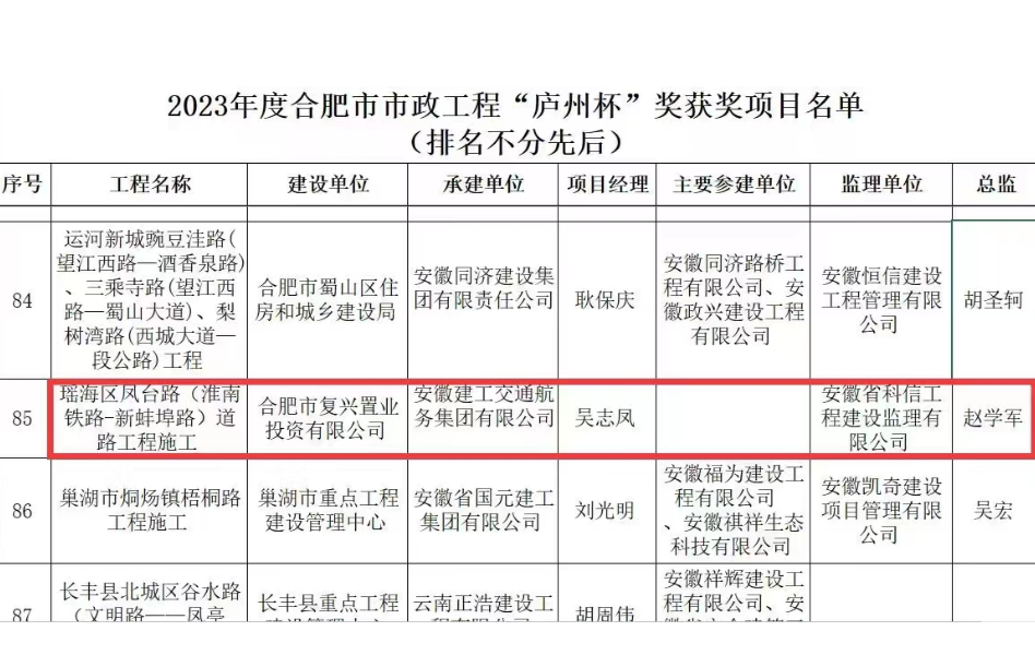 近日,2023年度合肥市市政工程“廬州杯”獎已公示完畢,建工交航承建的瑤海區(qū)鳳臺路(淮南鐵路-新蚌埠路)道路工程市政項目順利通過評審,榮獲該獎項。“廬州杯”獎是由合肥市市政工程協(xié)會組織評審,經(jīng)合肥市城鄉(xiāng)建設(shè)局審定,是合肥市市政工程建設(shè)領(lǐng)域最高質(zhì)量獎。