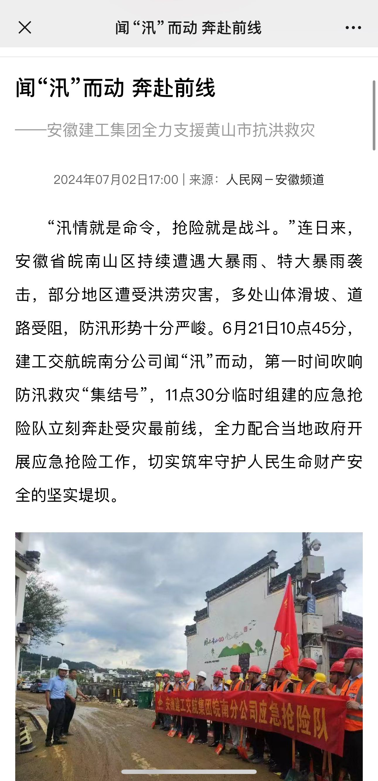 人民網(wǎng)安徽頻道以《聞“汛”而動(dòng) 奔赴前線——安徽建工集團(tuán)全力支援黃山市抗洪救災(zāi)》為題報(bào)道建工交航皖南分公司的搶險(xiǎn)工作。