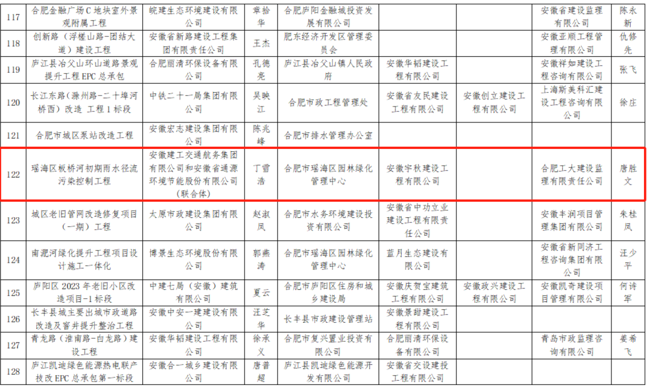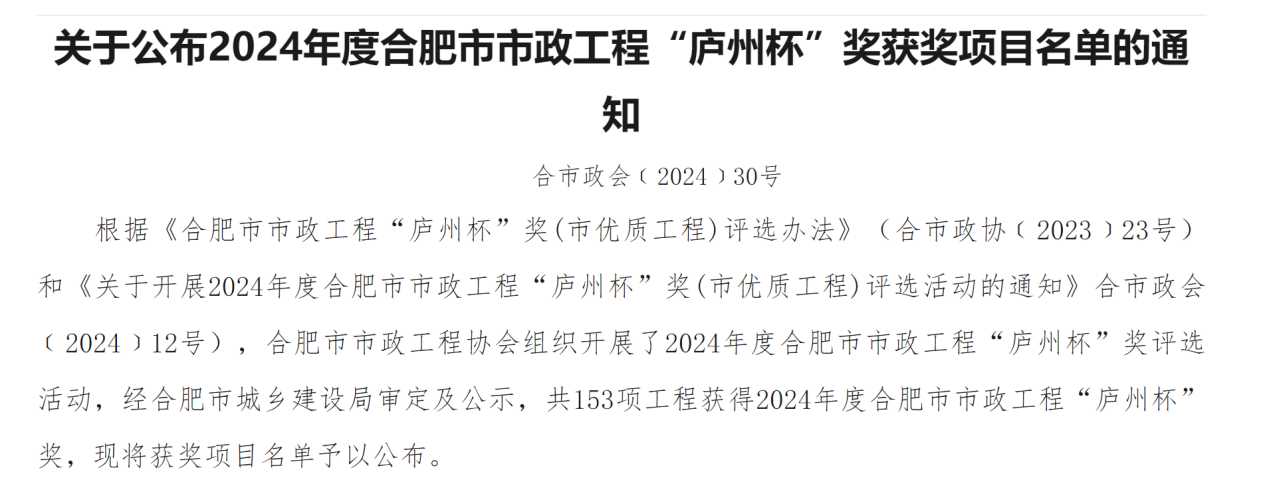 近日,經(jīng)合肥市城鄉(xiāng)建設(shè)局審定,合肥市市政工程協(xié)會正式公布2024年度合肥市市政工程“廬州杯”獲獎項目名單,我公司承建的瑤海區(qū)板橋河初期雨水徑流污染控制工程項目順利通過評審,榜上有名。
