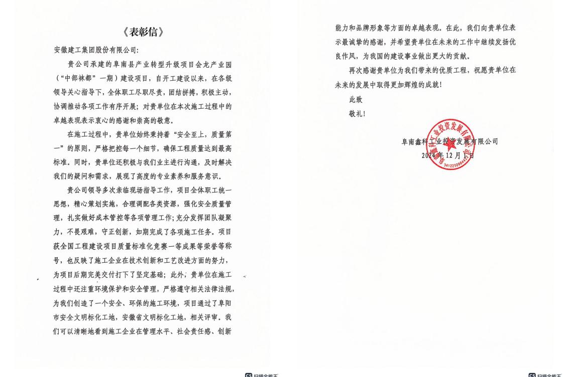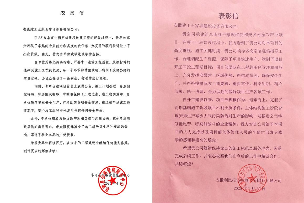 信中指出,安徽建工王家壩建投在項(xiàng)目建設(shè)過(guò)程中,全面落實(shí)阜南縣委、縣政府工作要求,扎實(shí)推進(jìn)重點(diǎn)項(xiàng)目建設(shè),取得積極成效。為全縣推進(jìn)高質(zhì)量發(fā)展做出積極貢獻(xiàn),為阜南縣重點(diǎn)項(xiàng)目建設(shè)再立新功。