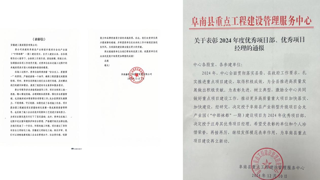 近日,安徽建工王家壩建設(shè)投資有限公司傳來(lái)喜訊,所屬多個(gè)項(xiàng)目先后榮獲屬地縣委、縣政府、主管部門、業(yè)主單位等表彰信,表?yè)P(yáng)我單位卓越項(xiàng)目管理與施工能力,彰顯了國(guó)企擔(dān)當(dāng)。