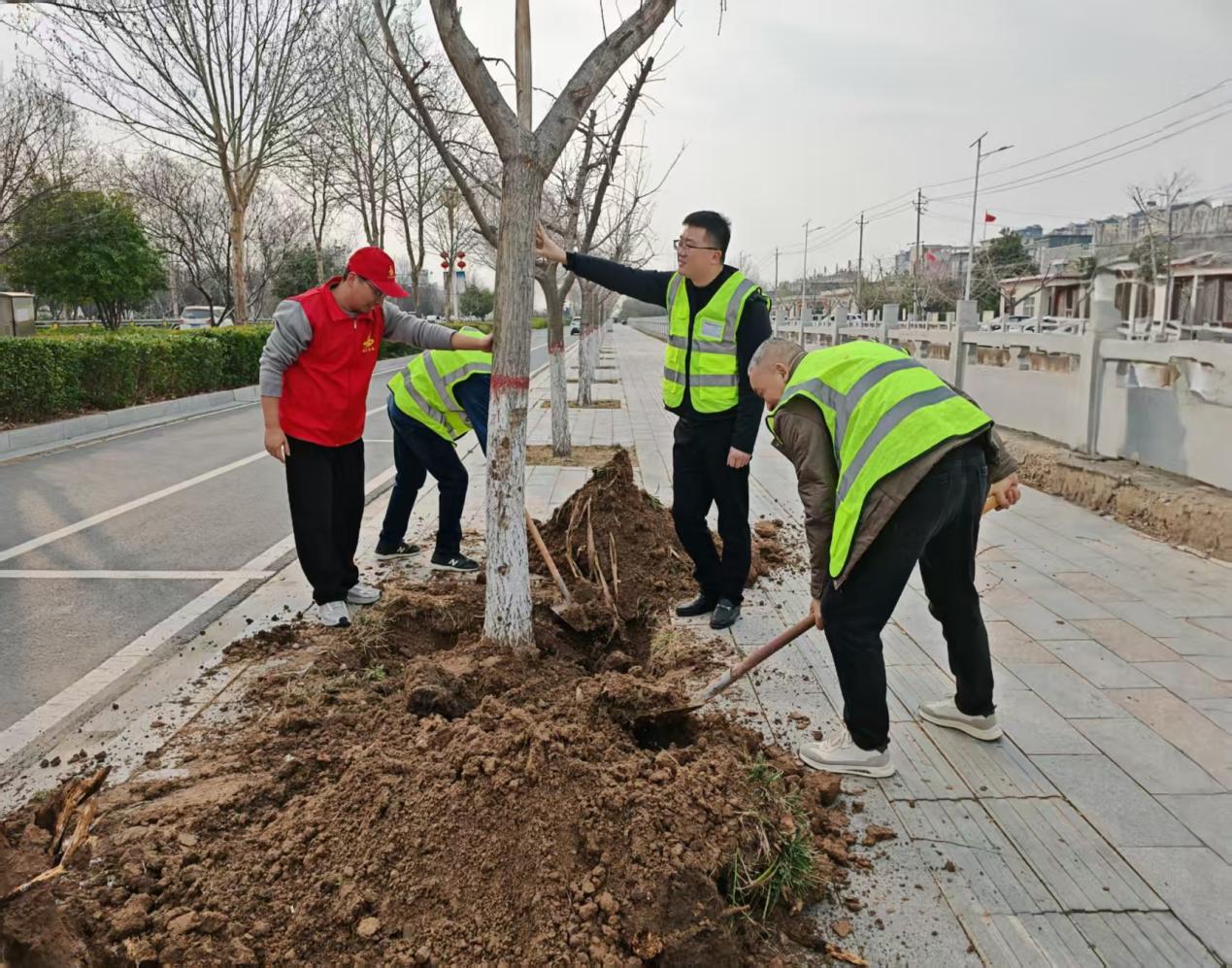 活動現(xiàn)場,黨員干部們熱情高漲、干勁十足。大家分工協(xié)作,揮鍬培土、扶苗圍堰、提水澆灌,每一道工序都一絲不茍。經過數小時的辛勤勞動,共栽培、修復樹木20余株,為初春的大地增添了一抹盎然綠意。