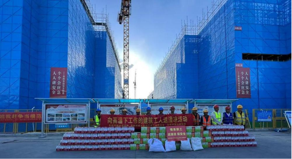 常利華聽(tīng)取了項(xiàng)目經(jīng)理關(guān)于安全生產(chǎn)管理、防暑降溫措施落實(shí)等情況的匯報(bào),親切詢問(wèn)工人作業(yè)時(shí)間調(diào)整、避暑設(shè)施配備等安排情況。他親手將礦泉水、綠茶等防暑物資送到工人手中,反復(fù)叮囑高溫作業(yè)要將安全健康放在首位,嚴(yán)格錯(cuò)峰施工,同時(shí)要求項(xiàng)目部細(xì)化防暑舉措,合理調(diào)配人力物力,保障工人健康與安全。