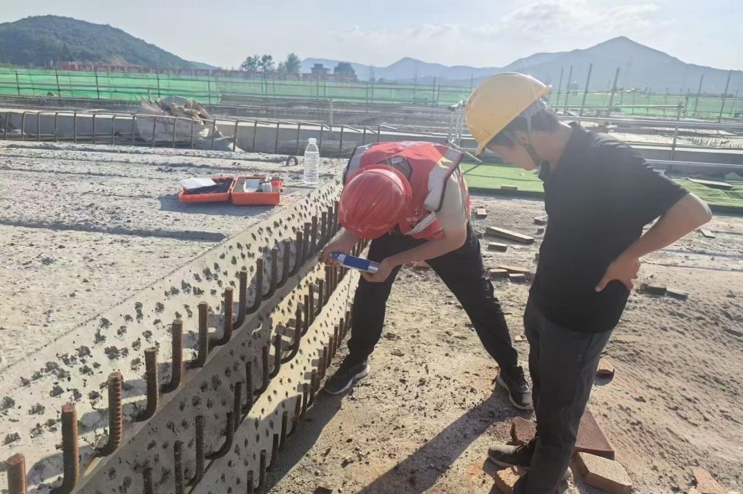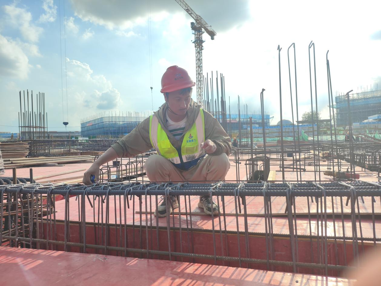 利辛縣科教推廣中心項目頂板上,鋼筋在烈日下被曬得燙手。施工員陳滿滿俯身其間,卷尺緊貼滾燙的鋼筋,逐點核查間距、綁扎質(zhì)量與保護層厚度。他認(rèn)真查看每個節(jié)點,往復(fù)丈量,一絲不茍記錄數(shù)據(jù)。
