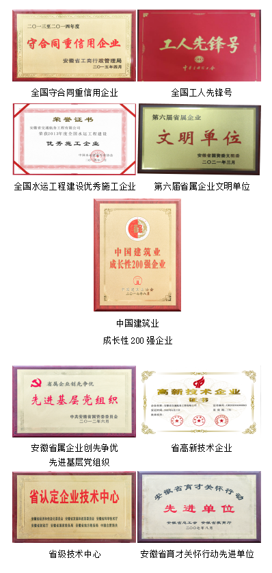 安徽省交通航務(wù)工程有限公司是安徽建工集團(tuán)旗下骨干成員企業(yè),系安徽省首家市政特級(jí)資質(zhì)企業(yè),已同集團(tuán)公司整體上市(股票代碼:600502),注冊資本10億元,擁有建筑裝修裝飾工程、古建筑工程、河湖整治工程、環(huán)保工程、地基基礎(chǔ)工程、電子與智能化工程、橋梁工程、隧道工程8項(xiàng)壹級(jí)專業(yè)承包資質(zhì),以及建筑工程施工、公路工程施工、港口與航道工程施工、機(jī)電工程施工4項(xiàng)壹級(jí)總承包資質(zhì),具備港口與航道工程、公路工程、水利水電工程、礦山工程、鋼結(jié)構(gòu)、地質(zhì)災(zāi)害處理、河湖整治等施工能力。近年來,公司先后獲評(píng)全國“重合同、守信用”企業(yè)、中國建筑業(yè)競爭性百強(qiáng)企業(yè)、全國水運(yùn)優(yōu)秀施工企業(yè)、省高新技術(shù)企業(yè)、第六屆省屬企業(yè)文明單位等殊榮,連續(xù)多年獲評(píng)“全國工人先鋒號(hào)”,擁有1個(gè)院士科研工作基地、1個(gè)省級(jí)企業(yè)技術(shù)中心、1個(gè)省級(jí)科技研發(fā)中心,近2年累計(jì)發(fā)明專利10項(xiàng)、省部級(jí)工法15項(xiàng)、實(shí)用新型專利20項(xiàng)。